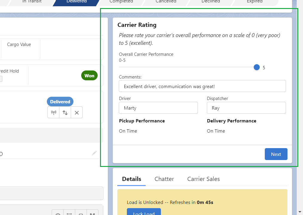 Streamline the feedback process by allowing carrier sales reps or any user to rate the performance of carriers after a delivery has been completed. This system captures quantitative and qualitative data on carrier performance, which can be used to enhance service quality, reliability, and customer satisfaction.