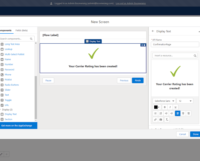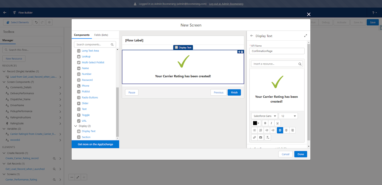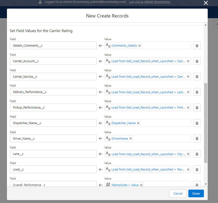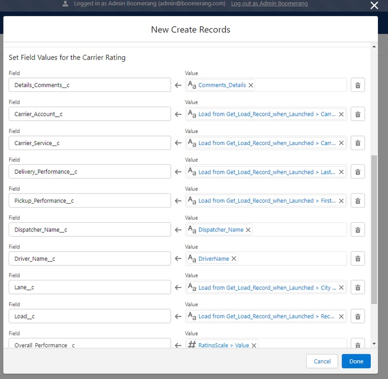 Set Field Values for the Carrier Rating– Using the field values from the Screen flow and the related Load record, we will map the new Carrier Rating record accordingly.