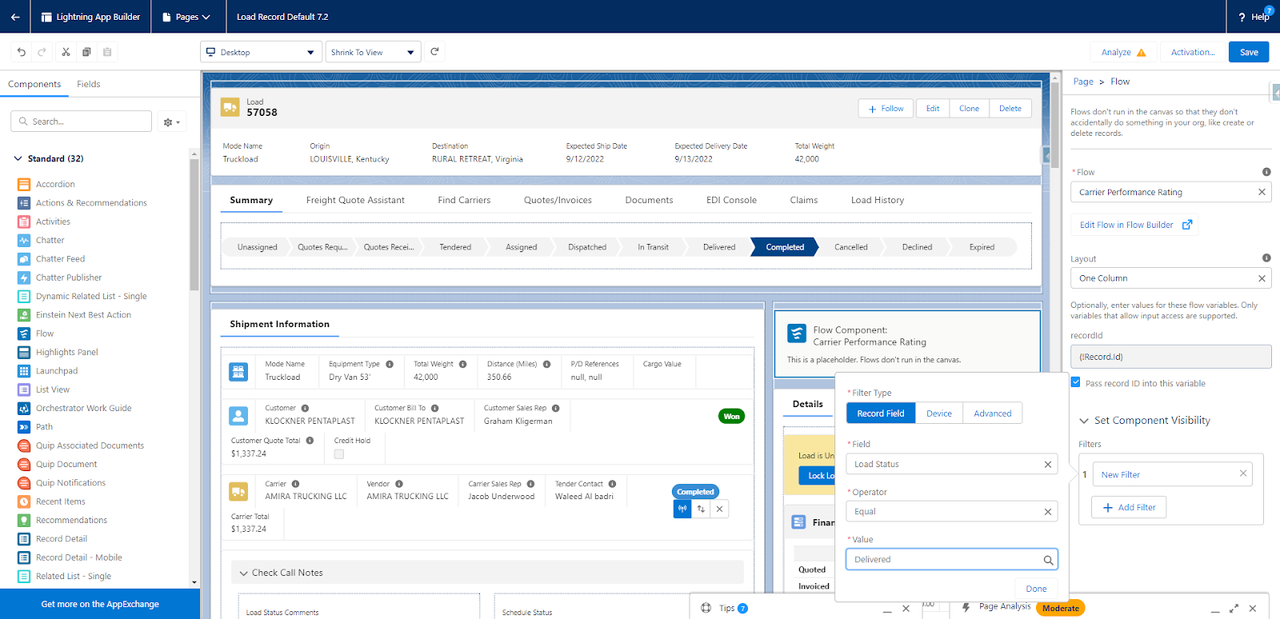 Per request, a visibility filter was placed on the Flow component to only show when the Load Status is set to Delivered.