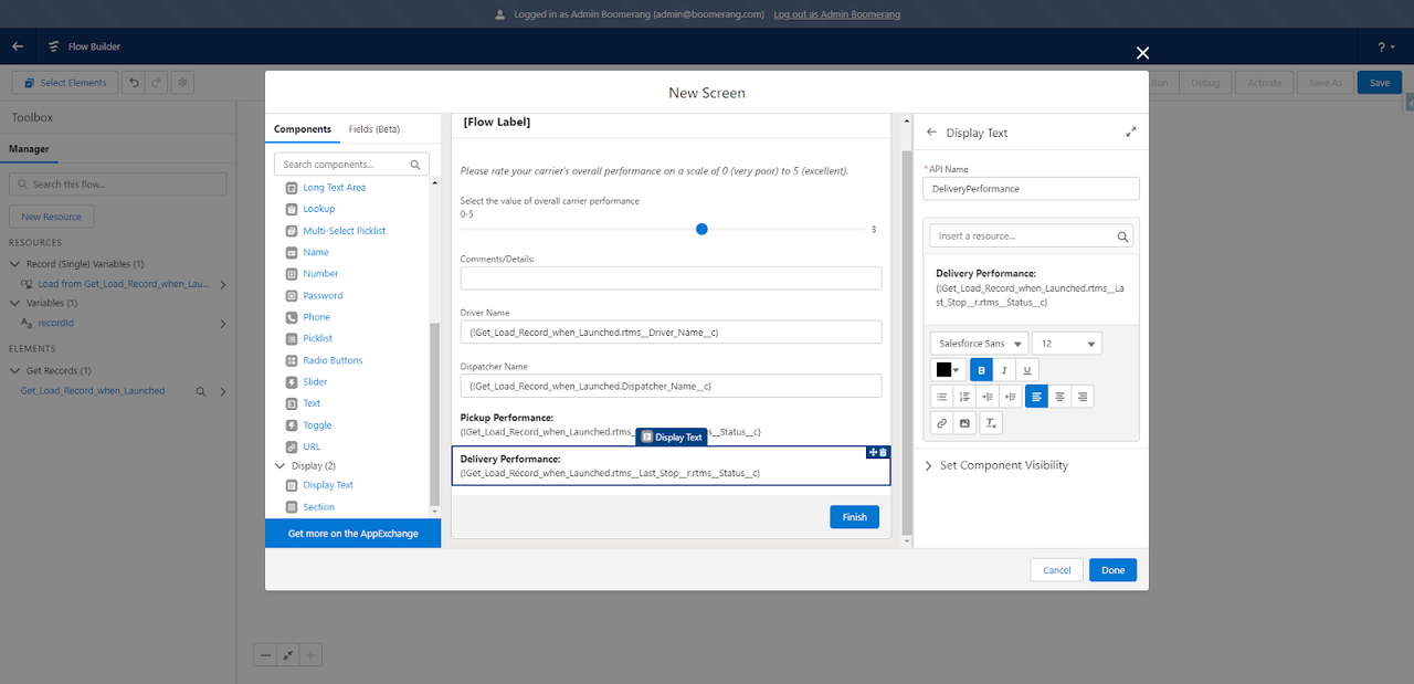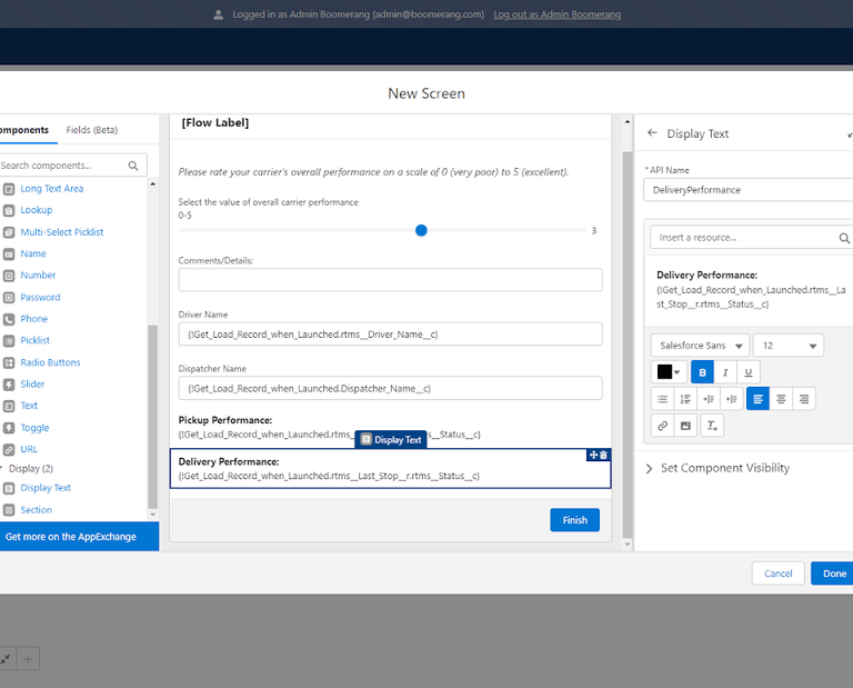 For this screen element, I have used the Slider component for rating. A Text element to capture additional comments/details/information. Two text fields to pull information from the Load record (Driver Name and Dispatcher Name). Then, two Display Text (read only fields) to give visibility to the Pickup/Delivery arrival status’.