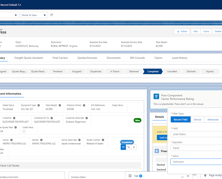 Description of solution: Based on the customer’s request, a custom object ‘Carrier Rating’ was created, and then a Screen Flow was created to capture feedback on carriers once a Load had been delivered. The data/information entered in the Screen Flow is used to create a record of a custom object, Carrier Rating.