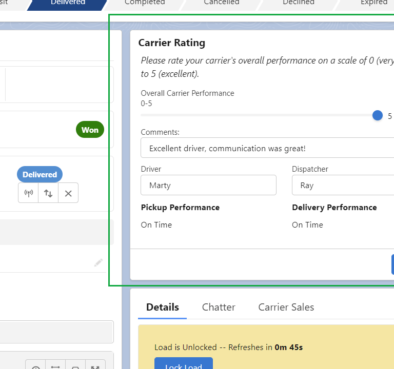 Use case: Once a load has been delivered, the carrier sales rep (or any user) can rate or score the carrier based on their overall performance.